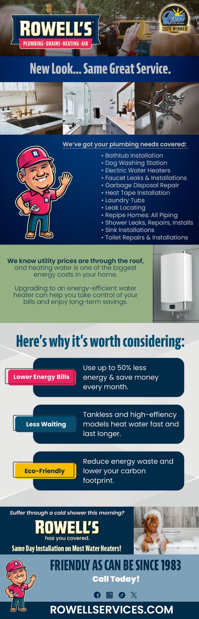 "Friendly As Can Be Since 1983!" When you need help with your plumbing, drains, heating, cooling or electrical in Madison, you can always rely on Rowell's Services! Call us now or book online!